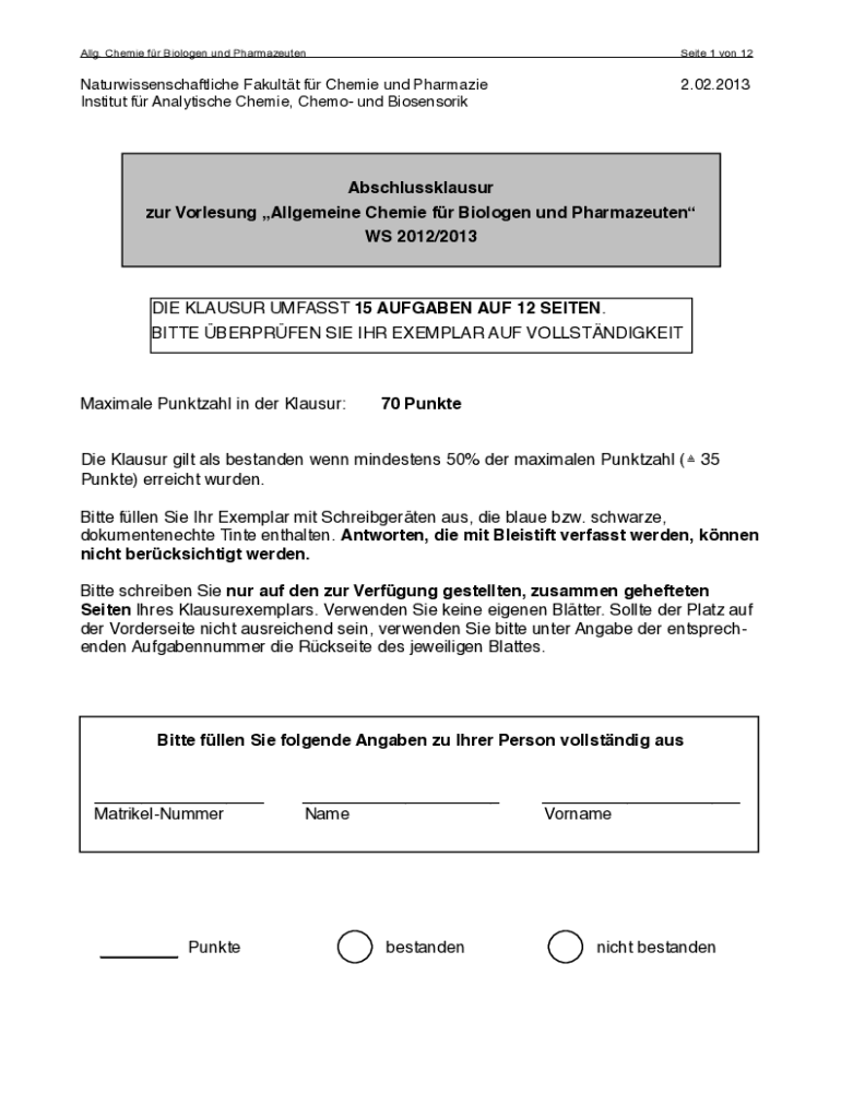 Allg. Chemie fr Biologen und PharmazeutenSeite !1 von 12 !Naturwissenschaftliche Fakultt fr Chemie und Pharmazie! Institut fr Analytische Chemie, Chemo und Biosensorik!!!!2.02.2013!!! Abschlussklausur!