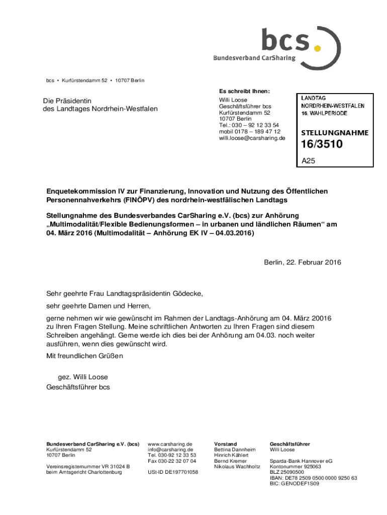 bcs Kurfrstendamm 52 10707 BerlinEs schreibt Ihnen:Die Prsidentin des Landtages NordrheinWestfalenWilli Loose Geschftsfhrer bcs Kurfrstendamm 52 10707 Berlin Tel.: 030 92 12 33 54 mobil 0178 189 47