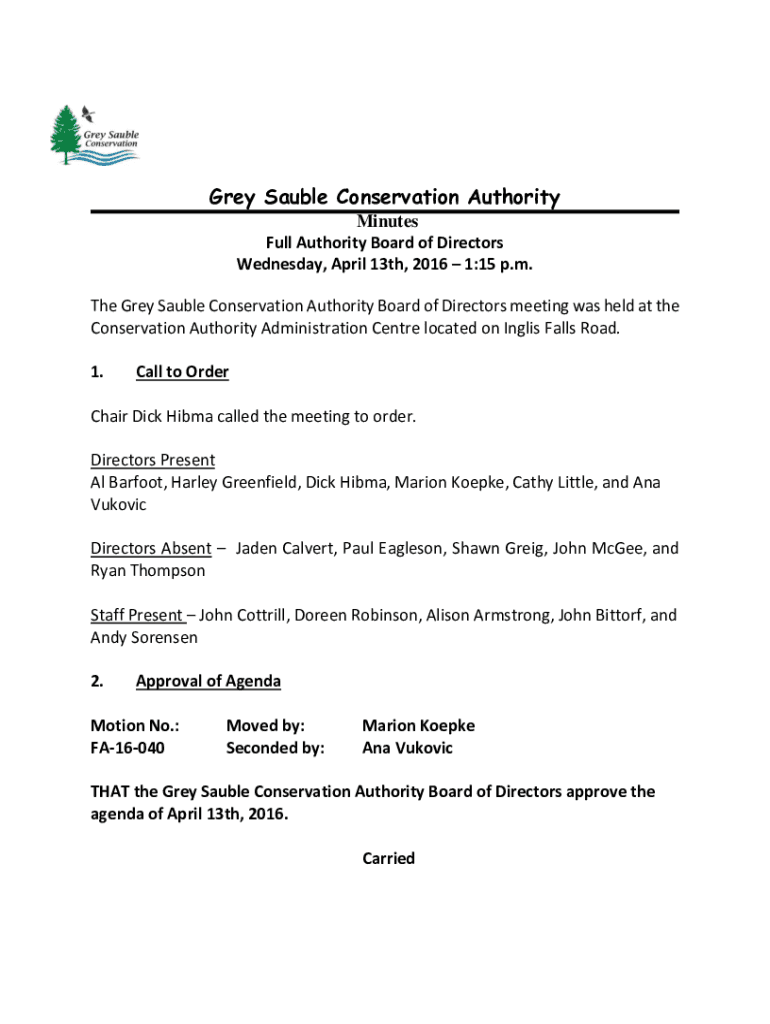 Grey Sauble Conservation Authority Minutes Full Authority Board of Directors Wednesday, April 13th, 2016 1:15 p.m. The Grey Sauble Conservation Authority Board of Directors meeting was held at the