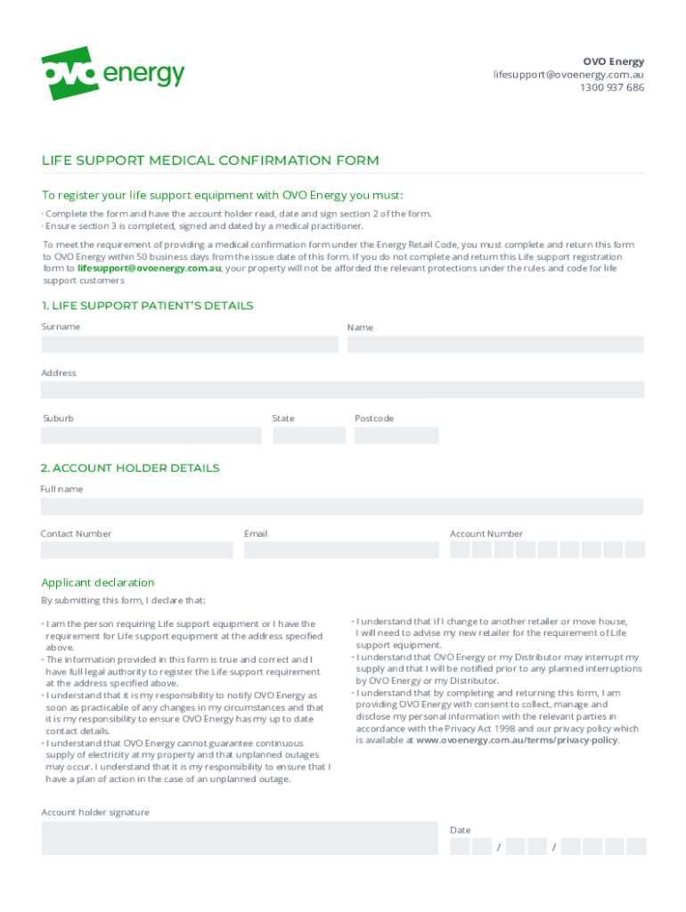 OVO Energy lifesupport@ovoenergy.com.au 1300 937 686LIFE SUPPORT MEDICAL CONFIRMATION FORM To register your life support equipment with OVO Energy you must: Complete the form and have the account