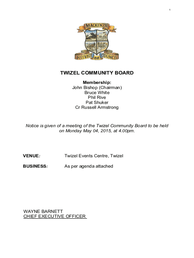 Cr Russell ArmstrongNotice is given of a meeting of the Twice Community Board to be held