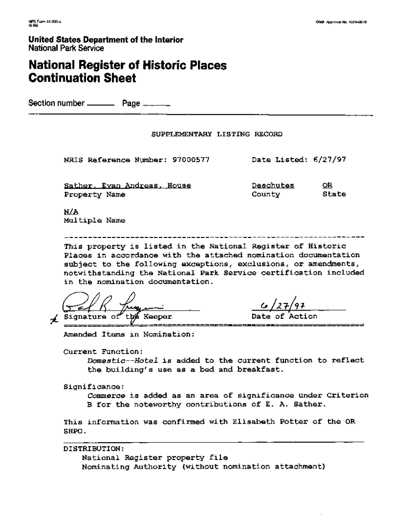 NPSFormlO900a (886)OMB Approval No. 10240018United States Department of the Interior National Park ServiceNational Register of Historic Places Continuation Sheet Section numberPageSUPPLEMENTARY LISTING