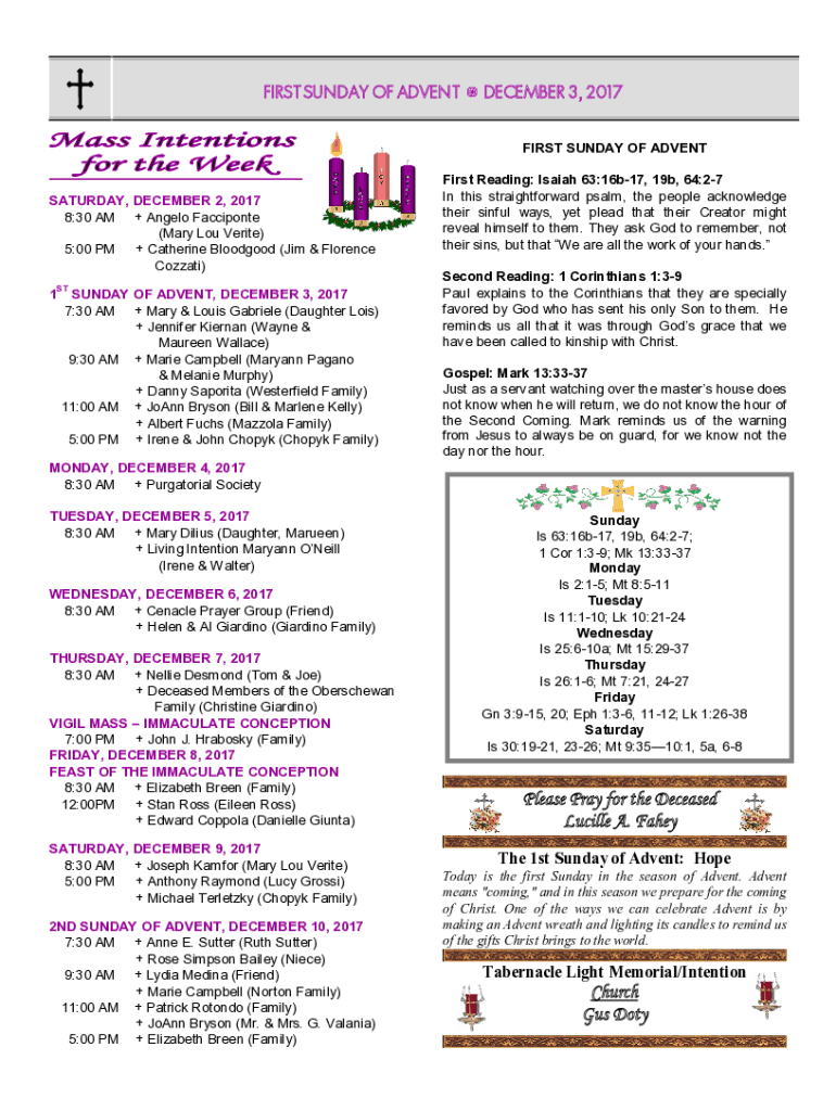FIRST THIRD SUNDAY SUNDAY OF OF ADVENT EASTER DECEMBER APRIL 30, 3, 2017 2017 FIRST SUNDAY OF ADVENTSATURDAY, DECEMBER 2, 2017 8:30 AM + Angelo Facciponte (Mary Lou Verite) 5:00 PM + Catherine Bloodgood