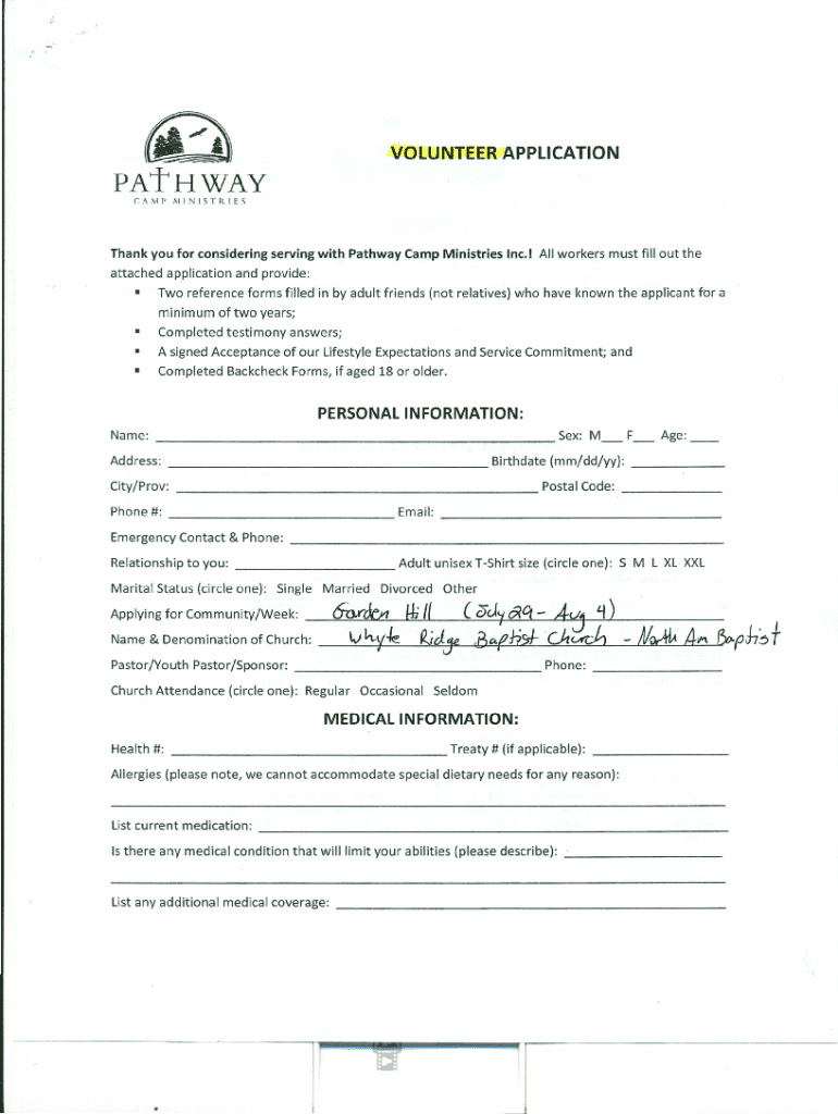 VOLUNTEER APPLICATIONPAtHWAY \'AMPMINISTRIESThank you for considering serving with PathwayCamp MinistriesInc.! All workers must fill out theattached application and provide: Two reference forms filled