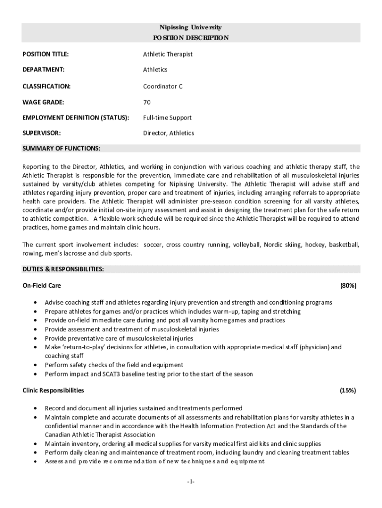 Nipissing University POSITION DESCRIPTION POSITION TITLE:Athletic TherapistDEPARTMENT:AthleticsCLASSIFICATION:Coordinator CWAGE GRADE:70EMPLOYMENT DEFINITION (STATUS):Fulltime SupportSUPERVISOR:Director,