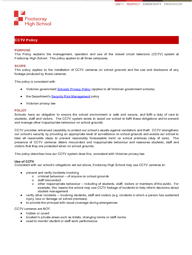 CCTV Policy PURPOSE This Policy explains the management, operation and use of the closed circuit television (CCTV) system at Footscray High School. This policy applies to all three campuses. SCOPE