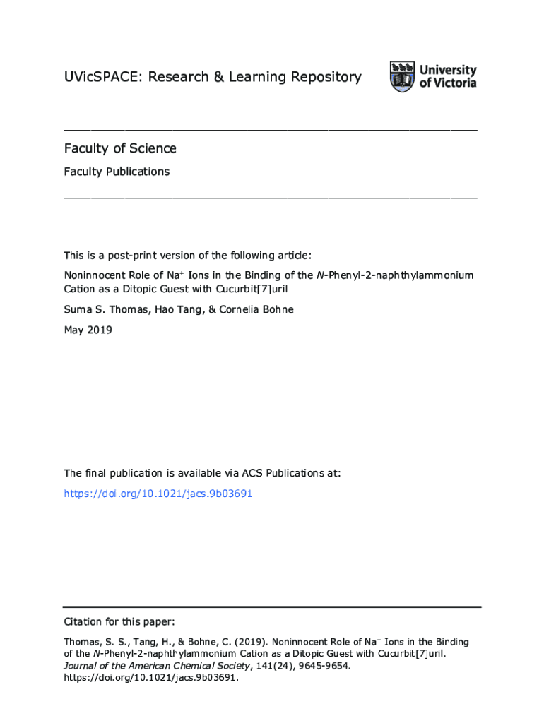 UVicSPACE: Research & Learning Repository ___Faculty of Science Faculty Publications ___This is a postprint version of the following article: Noninnocent Role of Na+ Ions in the Binding of the NPhenyl2naphthylammonium