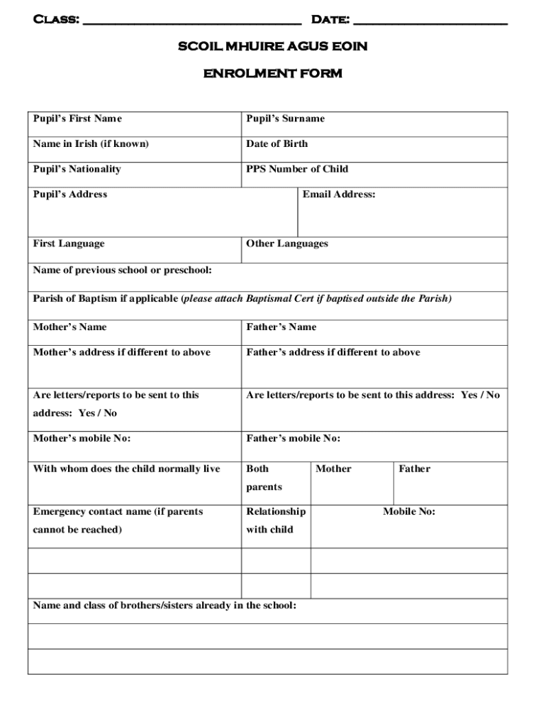 Class: ___ Date: ___ SCOIL MHUIRE AGUS EOIN ENROLMENT FORMPupils First NamePupils SurnameName in Irish (if known)Date of BirthPupils NationalityPPS Number of ChildPupils AddressFirst LanguageEmail