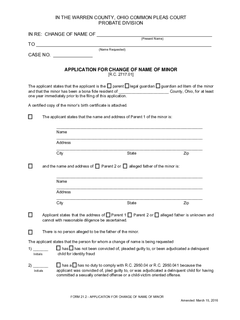 IN THE WARREN COUNTY, OHIO COMMON PLEAS COURT PROBATE DIVISION IN RE: CHANGE OF NAME OF ___ (Present Name)TO ___ (Name Requested)CASE NO. ___ APPLICATION FOR CHANGE OF NAME OF MINOR [R.C. 2717.01]