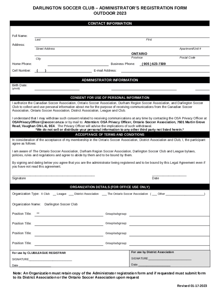 Instructions for the form DARLINGTON SOCCER CLUBADMINISTRATORS REGISTRATION (18 & Over)