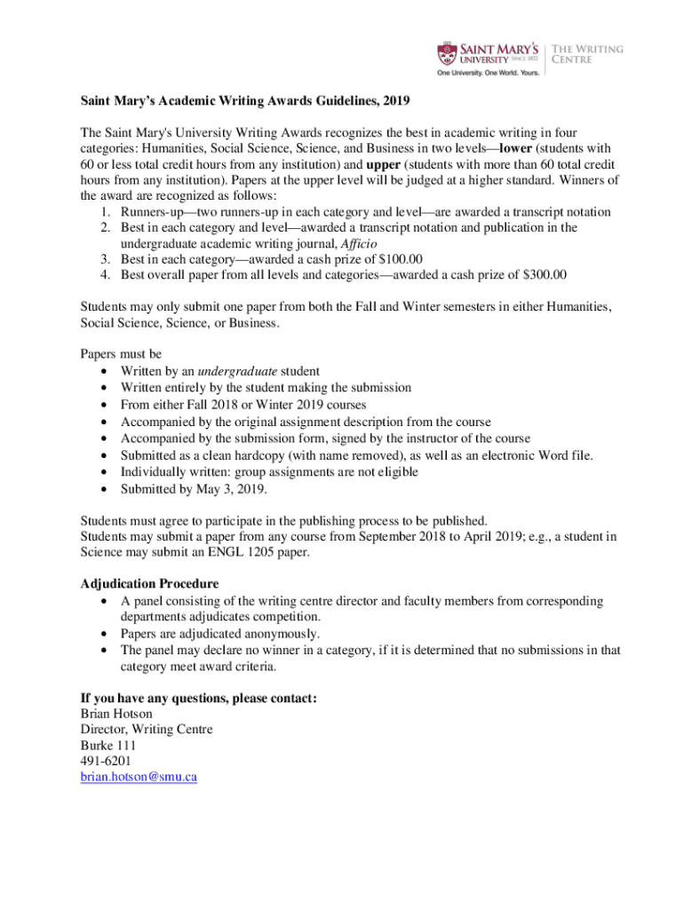 Saint Marys Academic Writing Awards Guidelines, 2019 The Saint Mary\'s University Writing Awards recognizes the best in academic writing in four categories: Humanities, Social Science, Science, and
