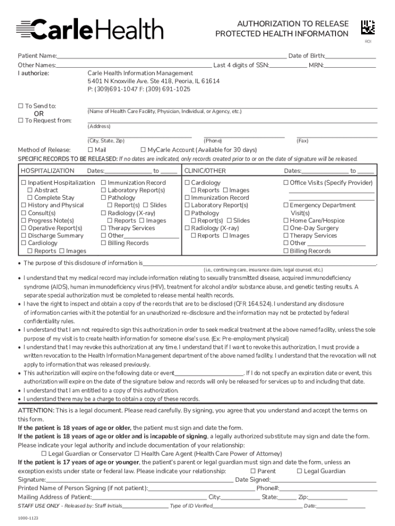 AUTHORIZATION TO RELEASE PROTECTED HEALTH INFORMATION ROIPatient Name: Other Names: I authorize:Date of Birth: MRN:Last 4 digits of SSN: Carle Health Information Management 5401 N Knoxville Ave. Ste