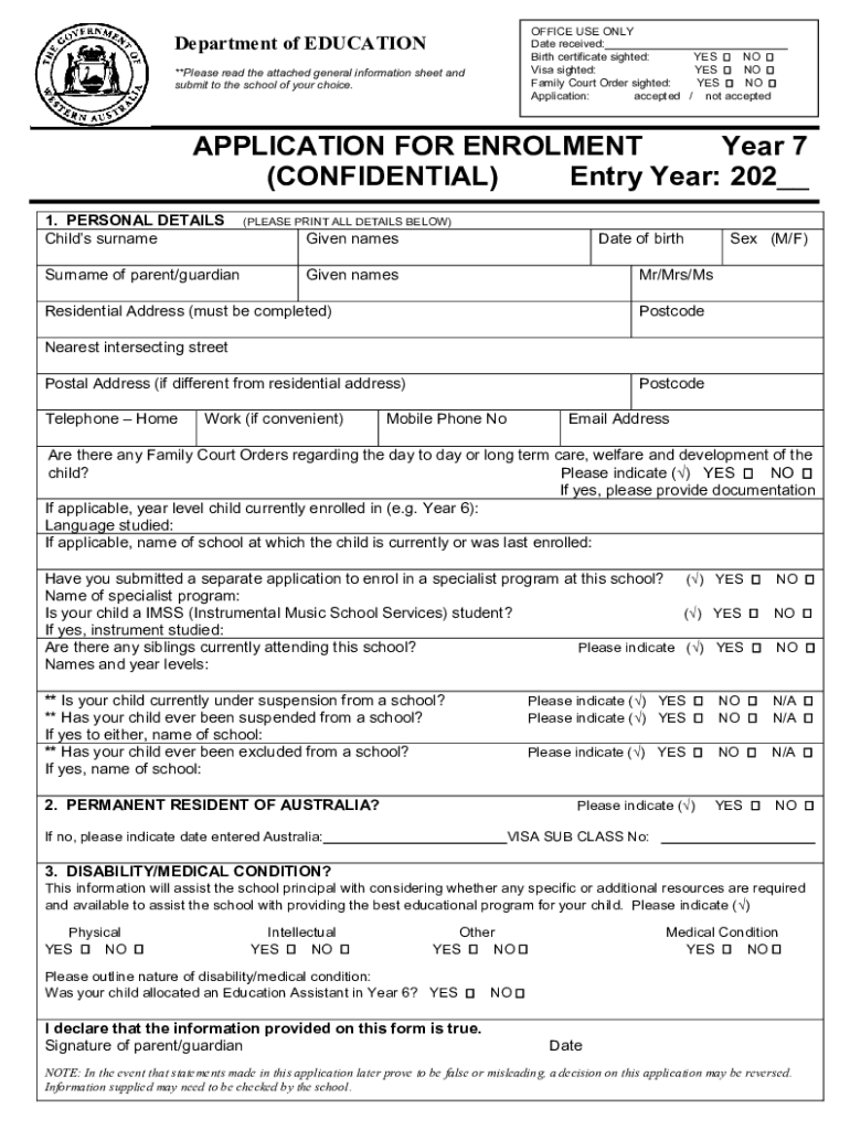 OFFICE USE ONLY Date received: Birth certificate sighted: YES NO Visa sighted: YES NO Family Court Order sighted: YES NO Application: accepted / not acceptedDepartment of EDUCATION **Please read the