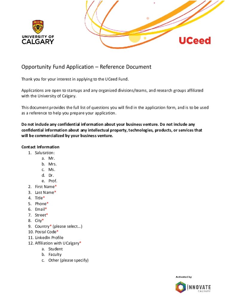 Opportunity Fund Application Reference Document Thank you for your interest in applying to the UCeed Fund. Applications are open to startups and any organized divisions/teams, and research groups