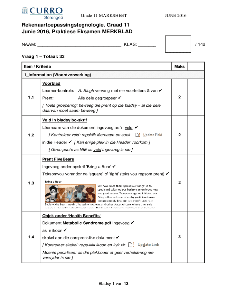 Grade 11 MARKSHEETJUNE 2016Rekenaartoepassingstegnologie, Graad 11 Junie 2016, Praktiese Eksamen MERKBLAD NAAM: ___ KLAS: ___/ 142Vraag 1 Totaal: 33 Item / KriteriaMaks1_Information (Woordverwerking)