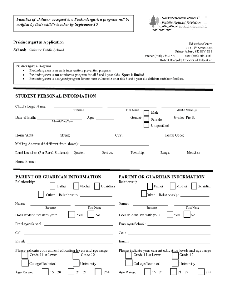 Families of children accepted to a Prekindergarten program will be notified by their childs teacher by September 15Prekindergarten ApplicationEducation Centre 545 11th Street East Prince Albert, SK