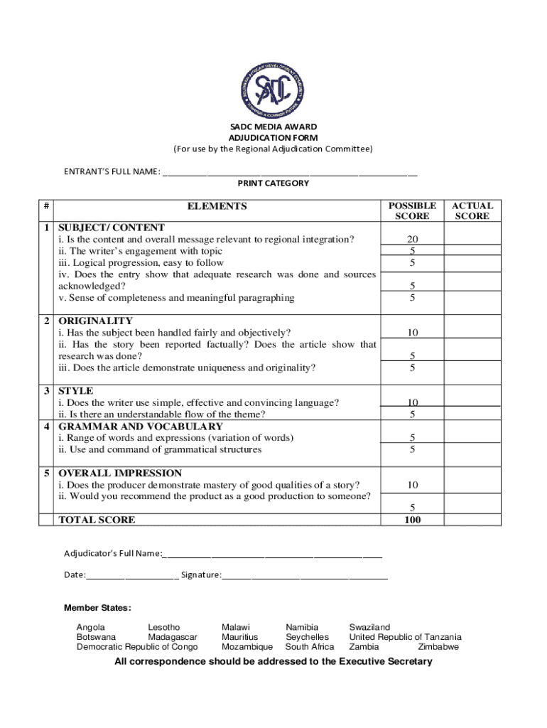 # SADCMEDIAAWARD ADJUDICATIONFORM (ForusebytheRegionalAdjudicationCommittee) ENTRANTSFULLNAME:___ PRINTCATEGORY POSSIBLE ELEMENTS SCORE1 SUBJECT/ CONTENT i. Is the content and overall message relevant