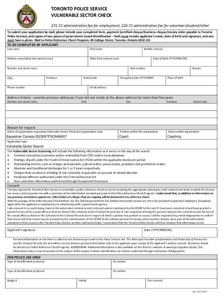 TORONTO POLICE SERVICE VULNERABLE SECTOR CHECK $71.72 administrative fee for employment, $26.72 administrative fee for volunteer/student/other To submit your application by mail, please include your