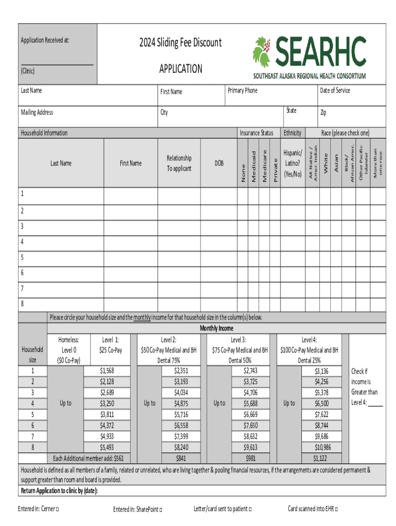 Application Received at:2024 Sliding Fee Discount(Clinic)APPLICATIONLast NameFirst NameMailing AddressCityPrimary PhoneDate of Service StateZip20More than one raceOther Pacific IslanderBlack/ African