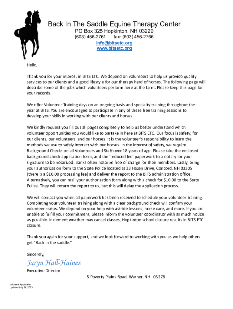 Back In The Saddle Equine Therapy Center PO Box 325 Opinion, NH 03229 (603) 4562761 fax: (603) 4562766 info@bitsetc.org www.bitsetc.orgHello, Thank you for your interest in BITS ETC. We depend on
