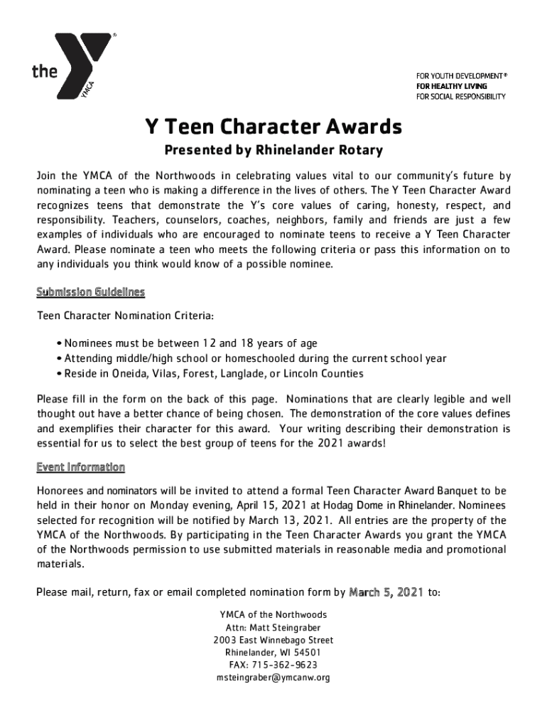 Y Teen Character Awards Presented by Rhinelander Rotary Join the YMCA of the Northwoods in celebrating values vital to our communitys future by nominating a teen who is making a difference in the