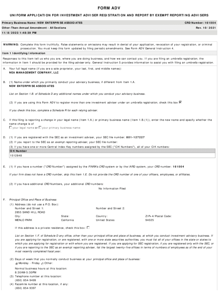 Primary Business Name: NEW ENTERPRISE ASSOCIATES CRD Number: 161004OtherThanAnnual Amendment