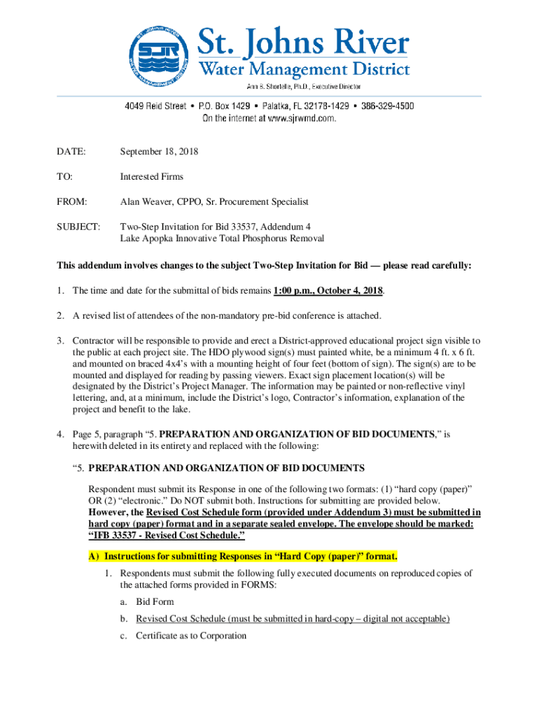 Get the free Two-Step Invitation for Bid 33537, Addendum 4 Lake Apopka ...