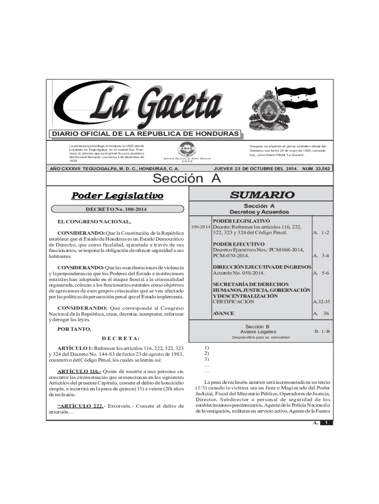 La Acetate GacetaSeccin A Accords y LeyesREPBLICA DE HONDURAS TEGUCIGALPA, M. D. C., 23 DE OCTUPLE DEL 2014No. 33,562DIARIO OFFICIAL DE LA REPUBLICAN DE HONDURAS