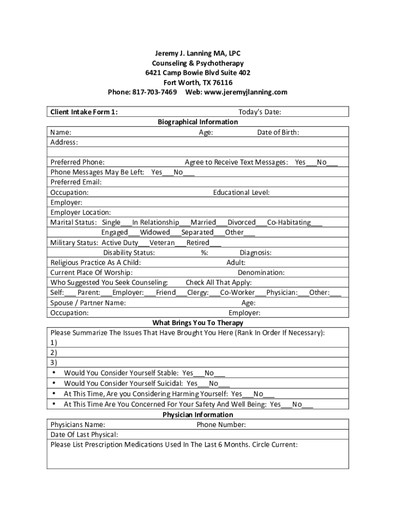 Jeremy J. Landing MA, Counseling & Psychotherapy6421 Camp Bowie Blvd Suite 402Fort Worth, TX 76116Phone: 8177037469Web: www.jeremyjlanning.comClient Intake Form 1:Today's Date:Biographical Informational:Age:Date of Birth:Address:Preferred Phone: