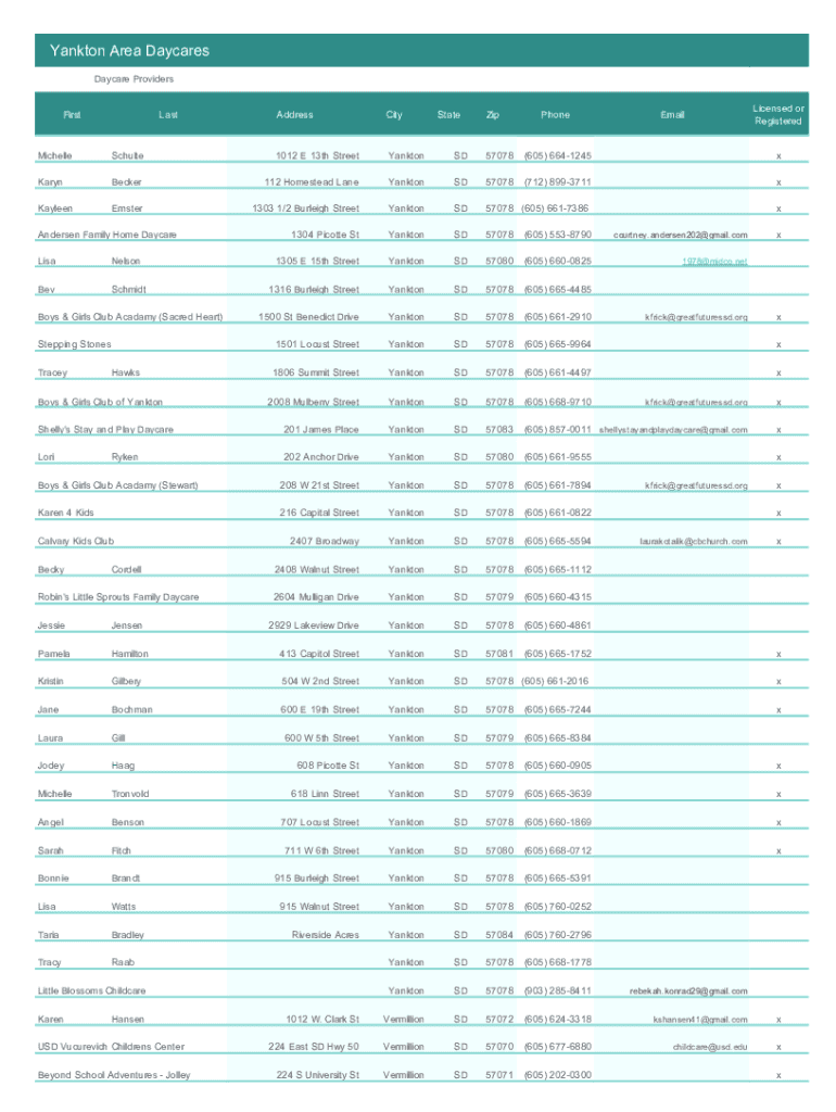 Yank ton Area Daycares Daycare ProvidersFirstLastAddressCityStateZipPhoneEmailLicensed or RegisteredMichelleSchulte1012 E 13th StreetYanktonSD57078(605) 6641245xKarynBecker112 Homestead LaneYanktonSD57078(712)