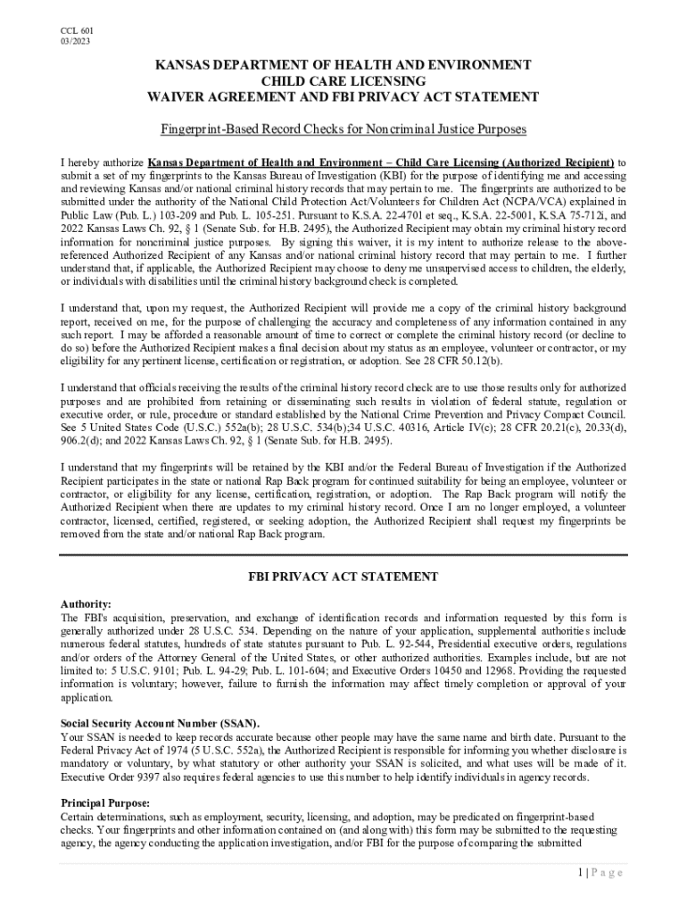 CCL 601 03/2023KANSAS DEPARTMENT OF HEALTH AND ENVIRONMENT CHILD CARE LICENSING WAIVER AGREEMENT AND FBI PRIVACY ACT STATEMENT Fingerprinted Record Checks for Noncriminal Justice Purposes I hereby