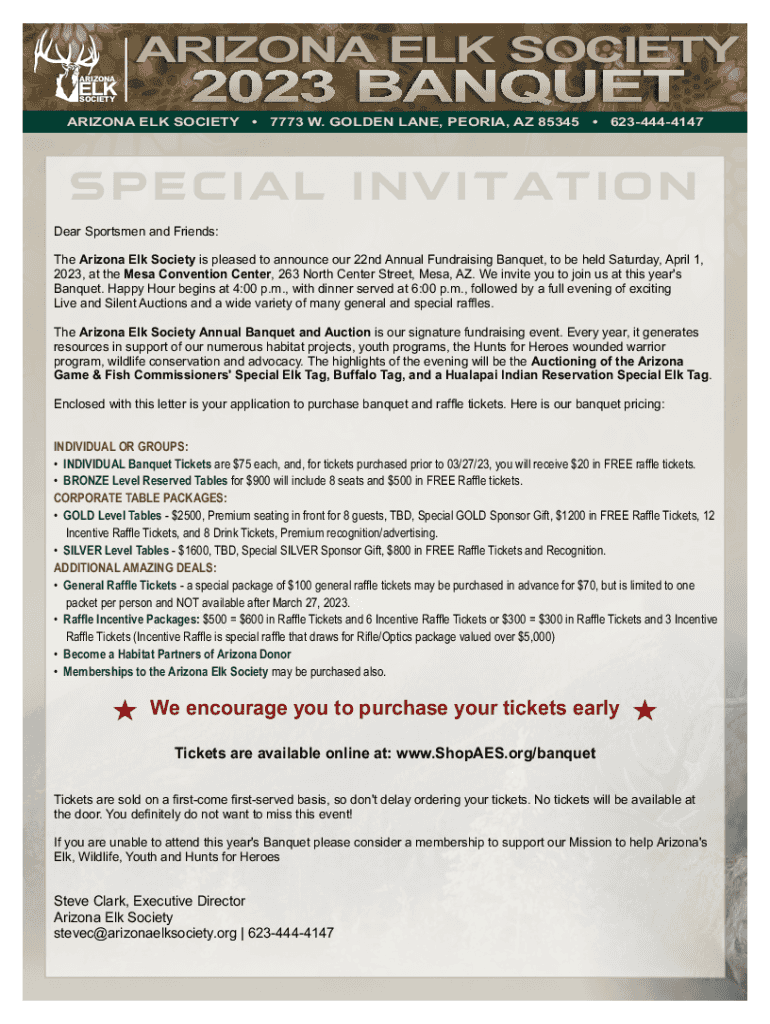 ARIZONASOCIETYARIZONAELKSOCIETY2023BANQUETARIZONAELKSOCIETY7773W.GELDERLAND, PEORIA,AZ853456234444147SPECIALINVITATIONDearSportsmenandFriendsTheArizonaElkSocietyispleasedtoannounceour22ndAnnualFundraisingBanquet,tobeheldSaturday,April1,