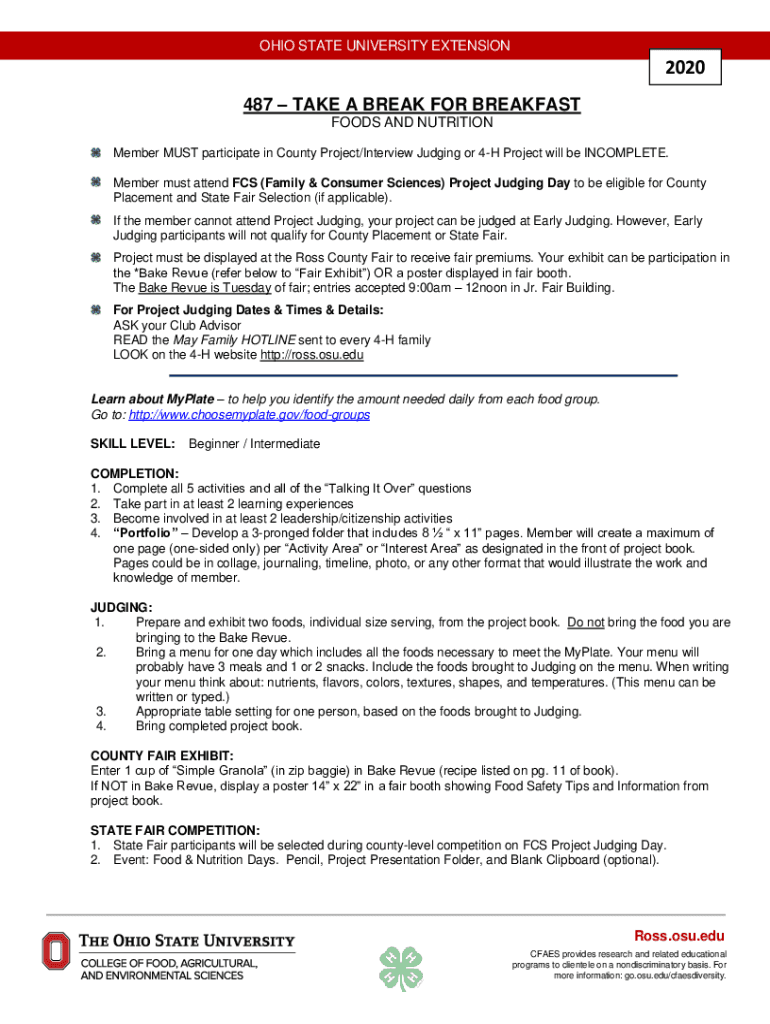 OHIO STATE UNIVERSITY EXTENSION2020 487 TAKE A BREAK FOR BREAKFAST FOODS AND NUTRITION Member MUST participate in County Project/Interview Judging or 4H Project will be INCOMPLETE. Member must attend
