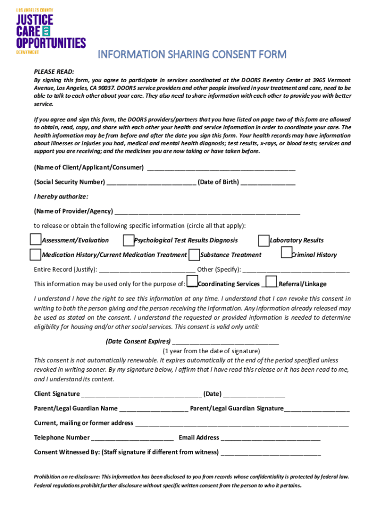 INFORMATION SHARING CONSENT FORM PLEASE READ: By signing this form, you agree to participate in services coordinated at the DOORS Reentry Center at 3965 Vermont Avenue, Los Angeles, CA 90037. DOORS