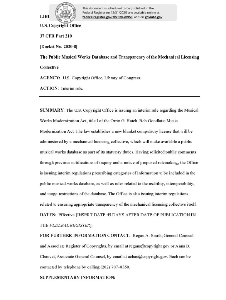 LIBRARY OFThis document is scheduled to be published in the Federal Register on 12/31/2020 and available online at CONGRESS federalregister.gov/d/202028958, and on govinfo.govU.S. Copyright Office
