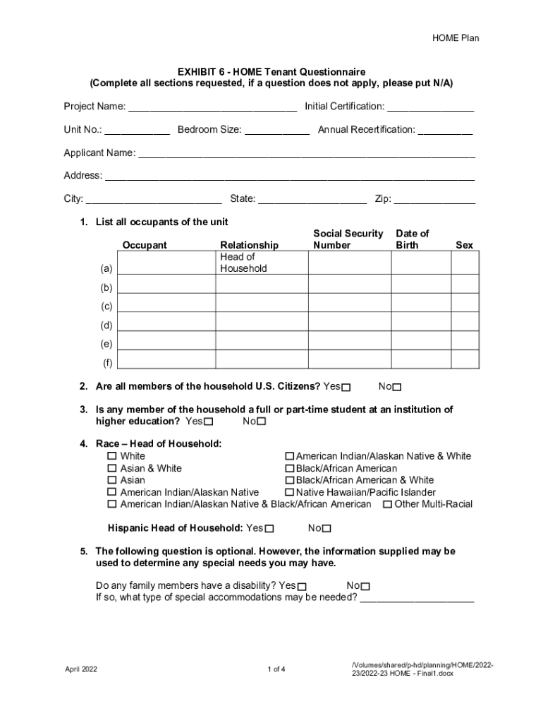 HOME PlanEXHIBIT 6 HOME Tenant Questionnaire (Complete all sections requested, if a question does not apply, please put N/A) Project Name: ___ Initial Certification: ___ Unit No.: ___ Bedroom Size: