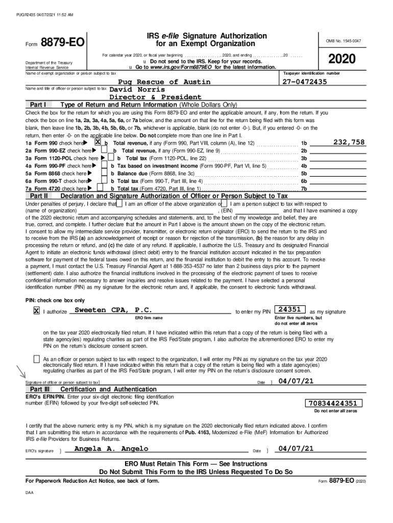 PUGR2435 04/07/2021 11:52 AMFormIRS efile Signature Authorization for an Exempt Organization8879EOOMB No. 15450047For calendar year 2020, or fiscal year beginning . . . . . . . . . . . . . . . . .