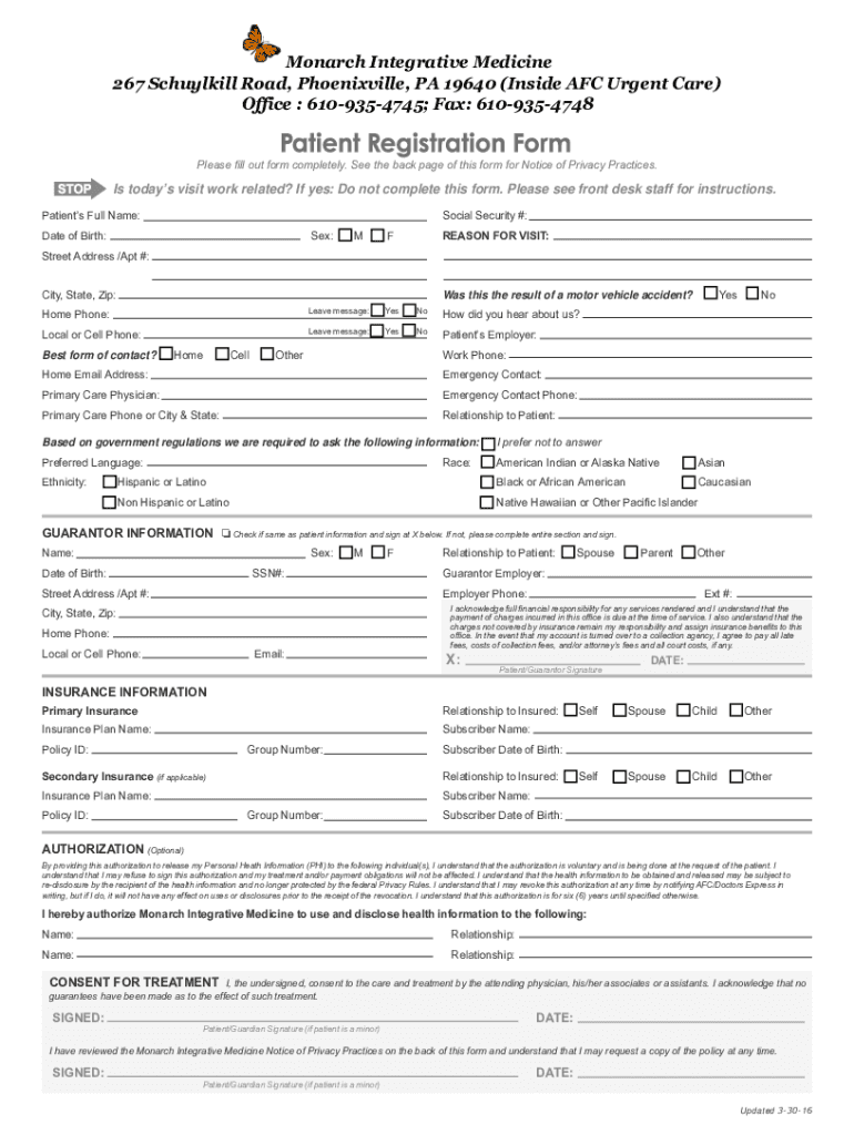 Monarch Integrative Medicine 267 Schuylkill Road, Phoenixville, PA 19640 (Inside AFC Urgent Care) Office : 6109354745; Fax: 6109354748Please ll out form completely. 6ee the back paJe of this form
