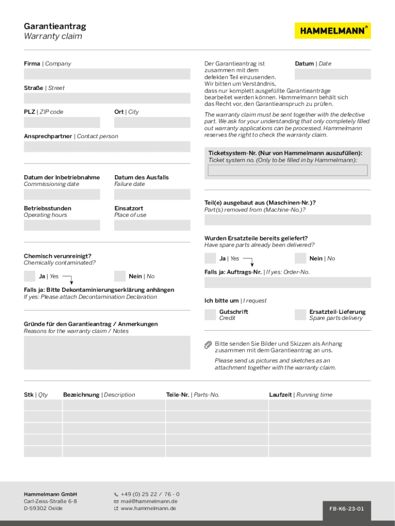 Garantieantrag Warranty claim Firma | CompanyDer Garantieantrag ist Datum | Date zusammen mit dem defekten Teil einzusenden. Wir bitten um Verstndnis, dass nur komplett ausgefllte Garantieantrge bearbeitet