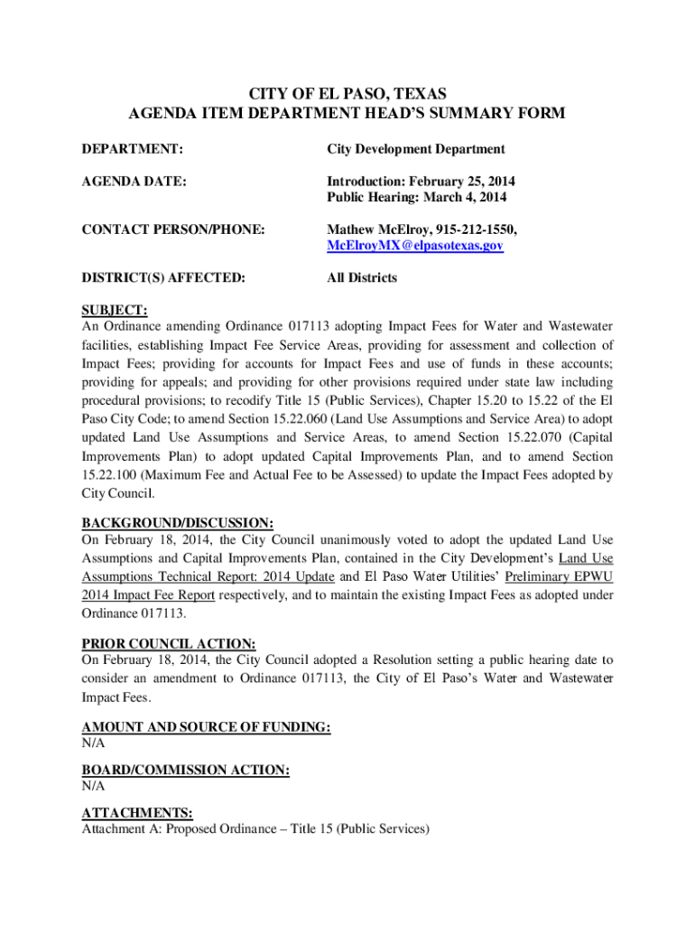 Get the free An Ordinance amending Ordinance 017113 adopting Impact Fees for Water and Wastewater