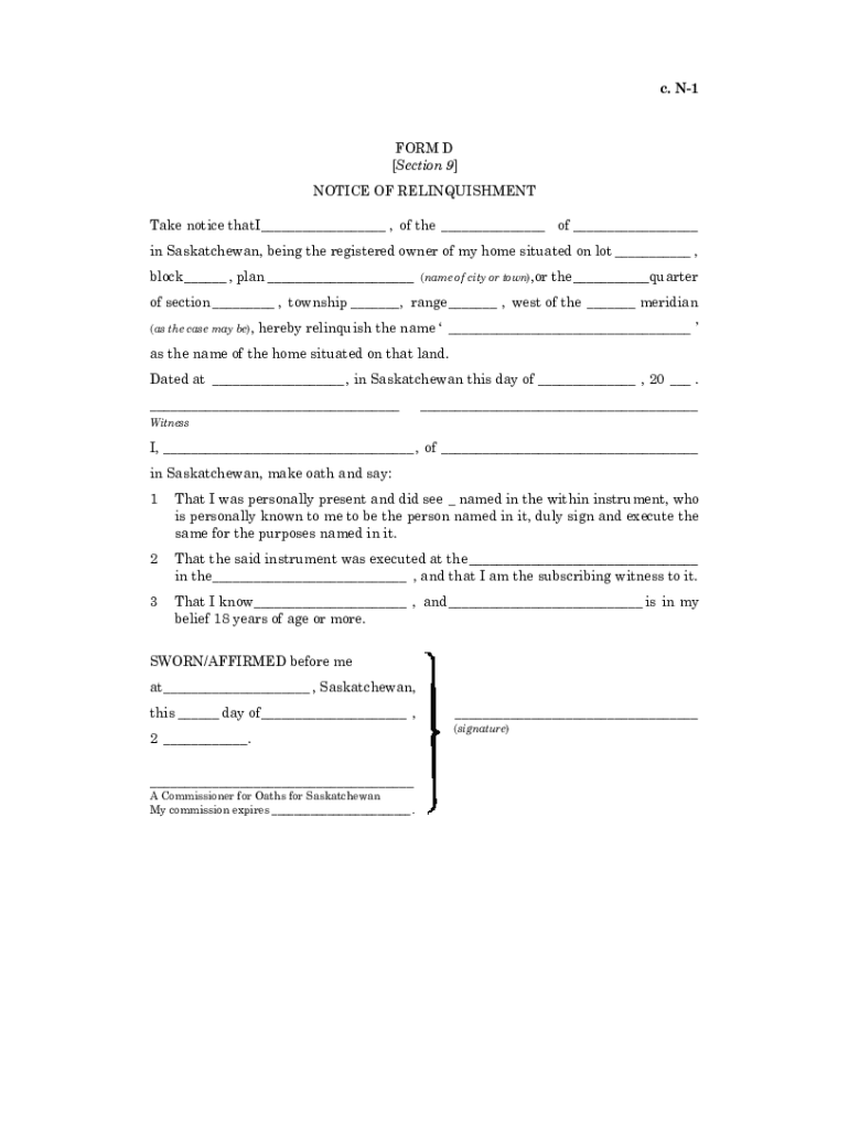 C. N1FORM D [Section 9] NOTICE OF RELINQUISHMENT Take notice that___, of the___of___ in Saskatchewan, being the registered owner of my home situated on lot___, block___, plan___(name of city or town),