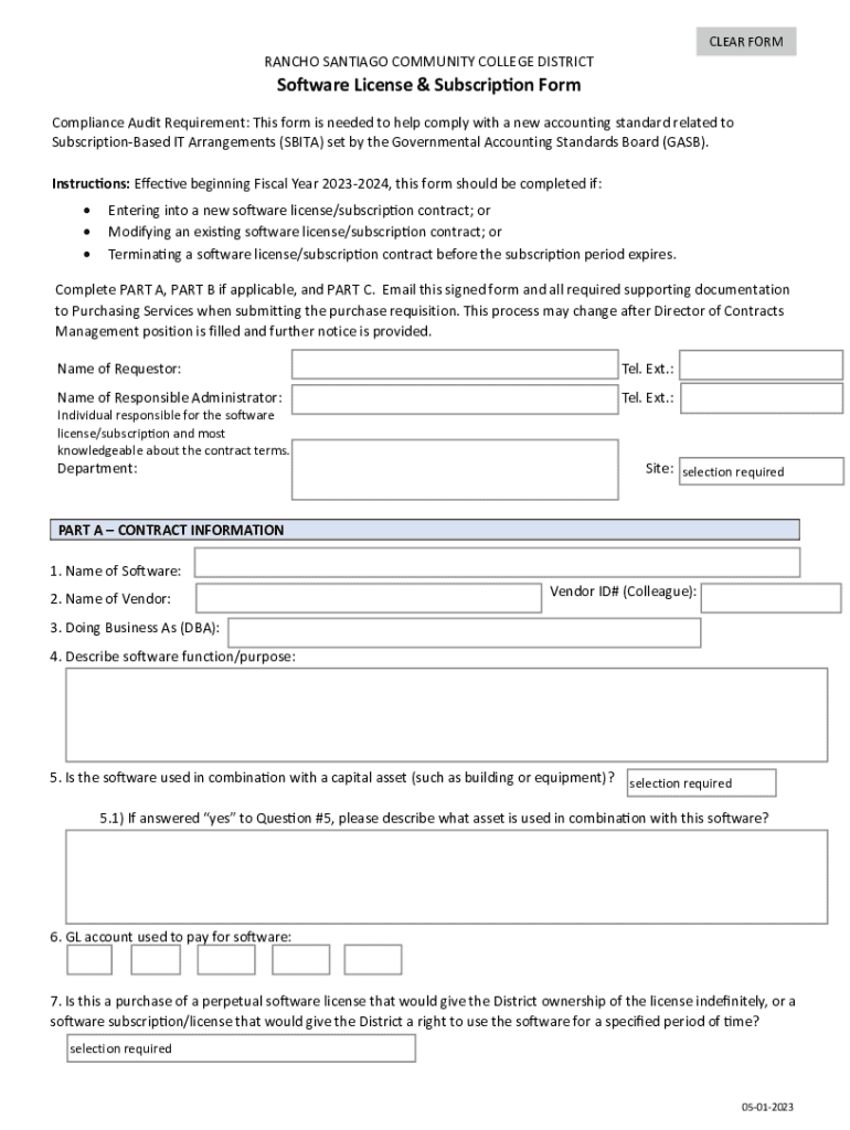 CLEAR FORMRANCHO SANTIAGO COMMUNITY COLLEGE DISTRICTSoware License & Subscription Noncompliance Audit Requirement: This form is needed to help comply with a new accounting standard related to