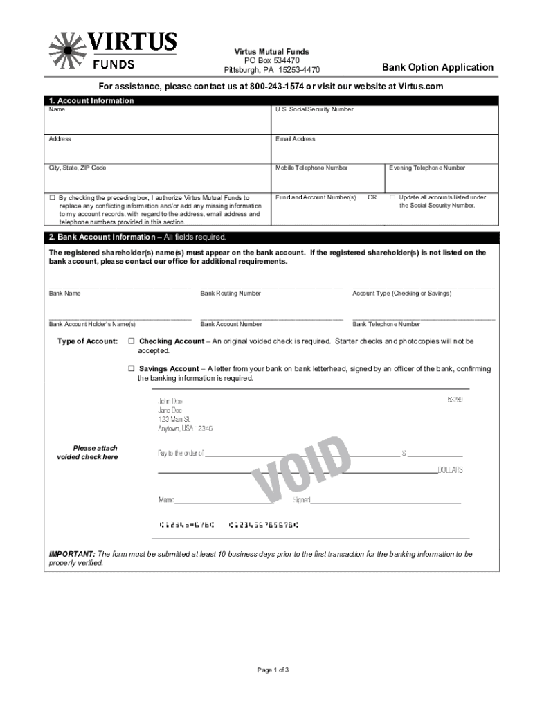 Pittsburgh, PA 152534470Bank Option Application assistance, please contact us at 8002431574 or visit our website at Virtus.com