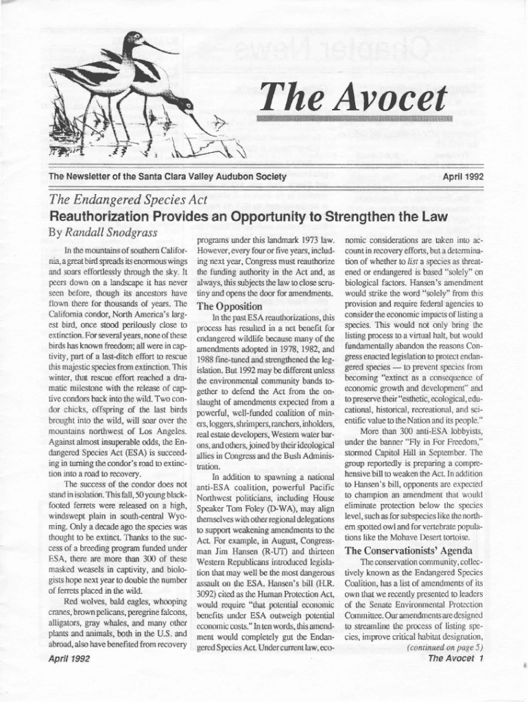 The Newsletter of the Santa Clara Valley AudubonSocietyApril 1992The Endangered Species Act