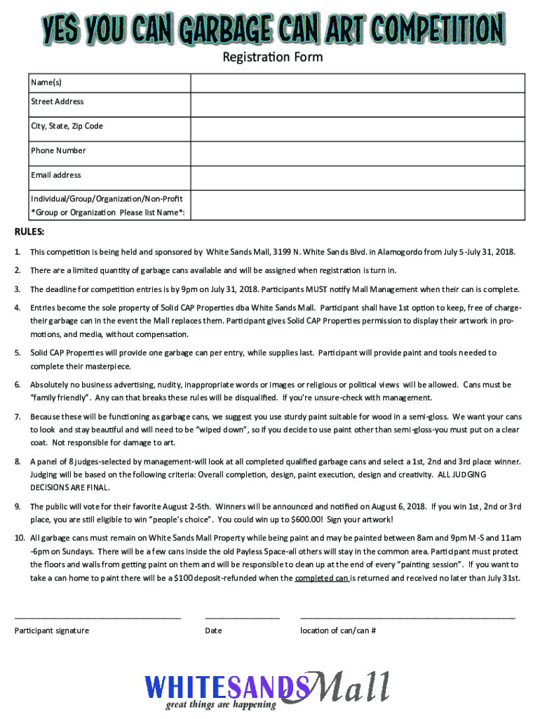 Registration Form Name(s) Street Address City, State, Zip Code Phone Number Email address Individual/Group/Organization/NonProfit *Group or Organization Please list Name*:RULES: 1.This competition