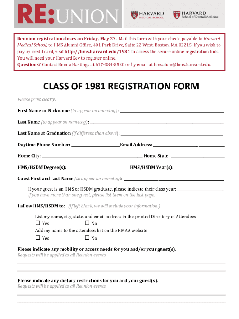 Reunion registration closes on Friday, May 27. Mail this form with your check, payable to Harvard Medical School, to HMS Alumni Office, 401 Park Drive, Suite 22 West, Boston, MA 02215. If you wish
