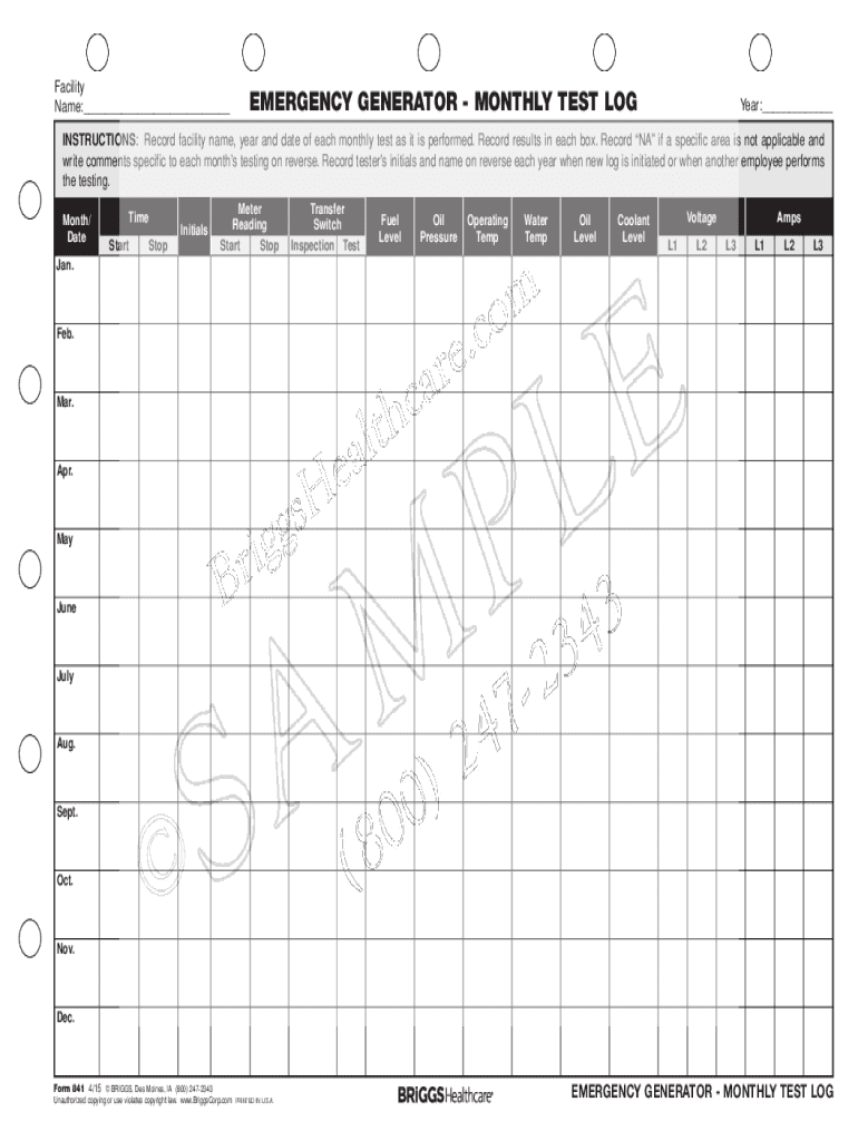 Name:___EMERGENCY GENERATOR MONTHLY TEST Logier:___INSTRUCTIONS: Record facility name, year and date of each monthly test as it is performed. Record results in each box. Record NA if a specific