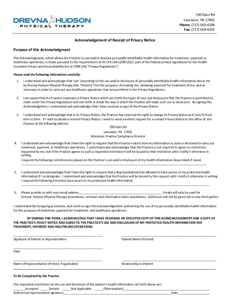 700 Eden Rd Lancaster, PA 17601 Phone: (717) 5694184 Fax: (717) 5694192Acknowledgement of Receipt of Privacy Notice Purpose of this Acknowledgment, which allows the Practice to use and/or disclose