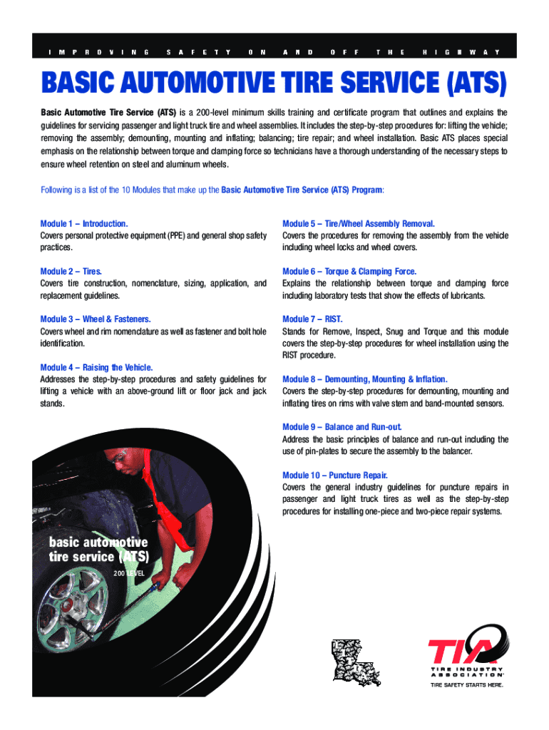 Basic Automotive Tire Service (ATS) is a 200level minimum skills training and certificate program that outlines and explains the