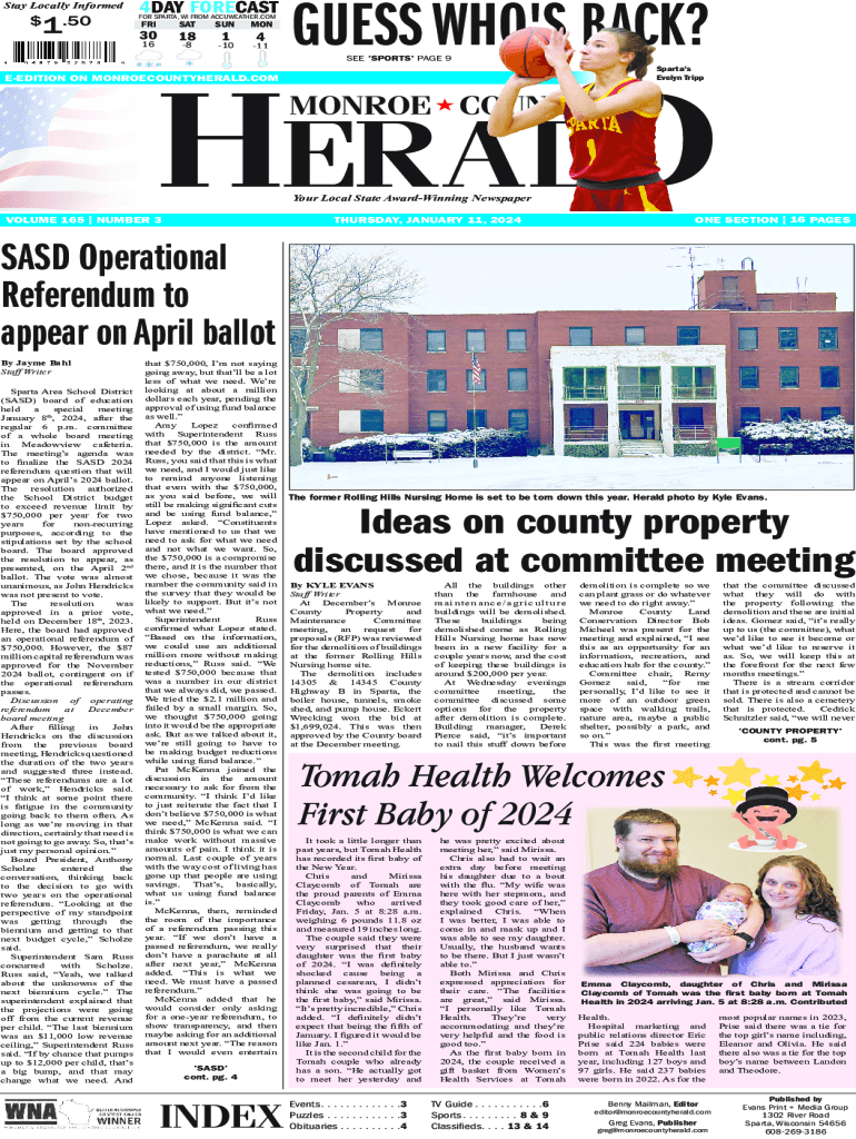 Stay Locally Informed1.50$4DAY FORECASTFOR SPARTA, WI FROM ACCUWEATHER.COMFRI30SAT18168SUN110MON411GUESS WHO\'S BACK? SEE \'SPORTS\' PAGE 9Sparta\'s Evelyn TrippHERALDEEDITION ON MONROECOUNTYHERALD.COMMONROE